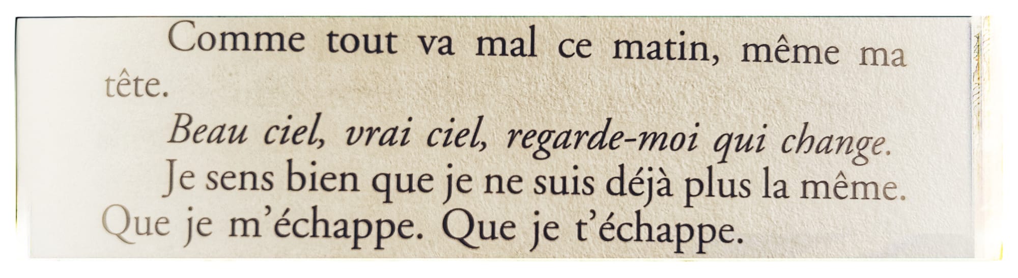 Merci pour tes non-dits, tes impossibles, tes maladresses, tes déviances, tes regrets éternels, ta culpabilité, merci pour tes silences sordides, merci pour ton irrespect de moi, pour ton mépris de nous, merci de m’oublier chaque jour un peu plus, merci de faire semblant que rien n’a eu d’importance, merci de reléguer le merveilleux au rang de déchets subalternes...